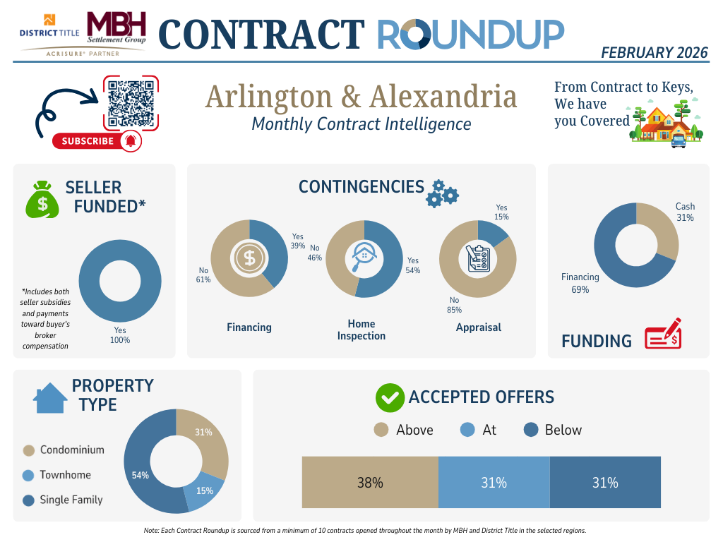 Arlington and Alexandria experienced a balanced pricing environment, with offers distributed between above asking (38%), at asking (31%), and below asking (31%). Single Family Homes made up the largest share of property types at 54%, while cash purchases accounted for a notable 31% of transactions. Seller-funded contributions were included in every contract, highlighting continued seller participation in facilitating deals.