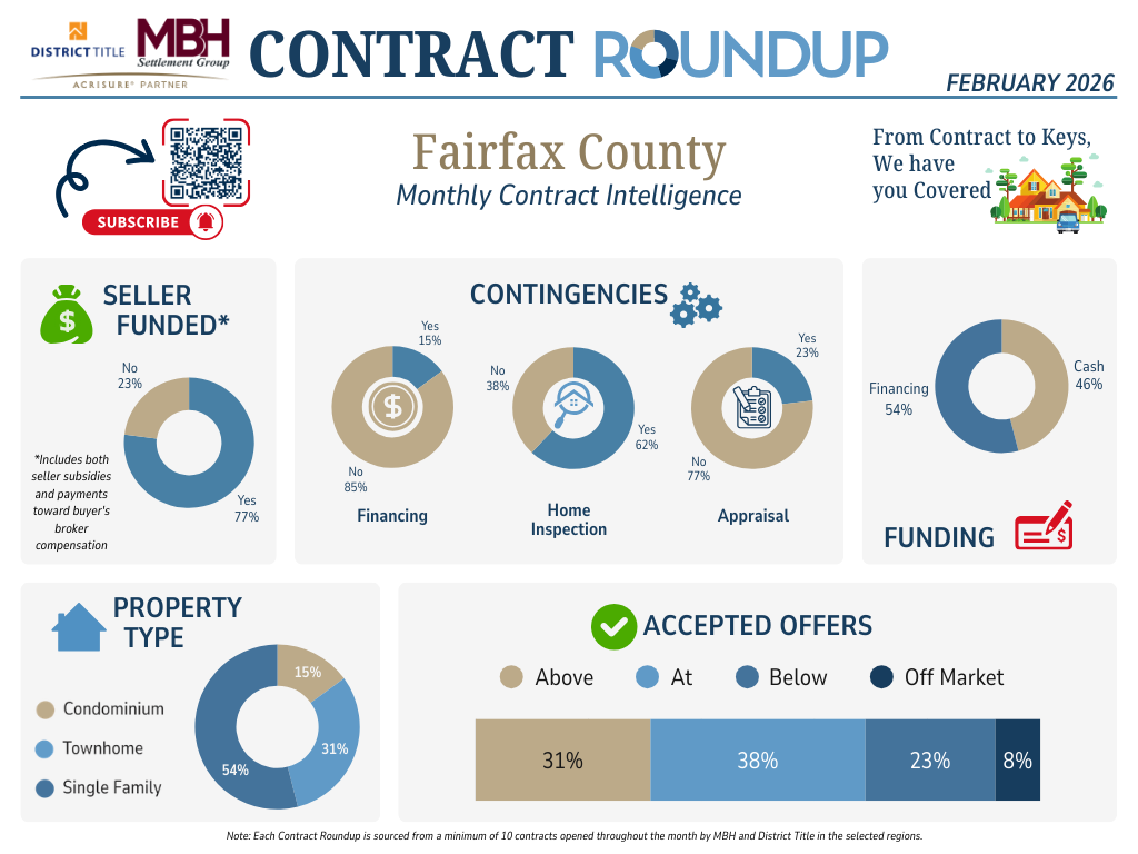 Fairfax County displayed a balanced but competitive market, with offers spread between above asking (31%), at asking (38%), and below asking (23%), along with a small share of off-market deals. Cash buyers made a significant showing at 46% of purchases, one of the highest across all regions. Single-family homes led the property mix, and seller-funded contributions were included in 77% of contracts.
