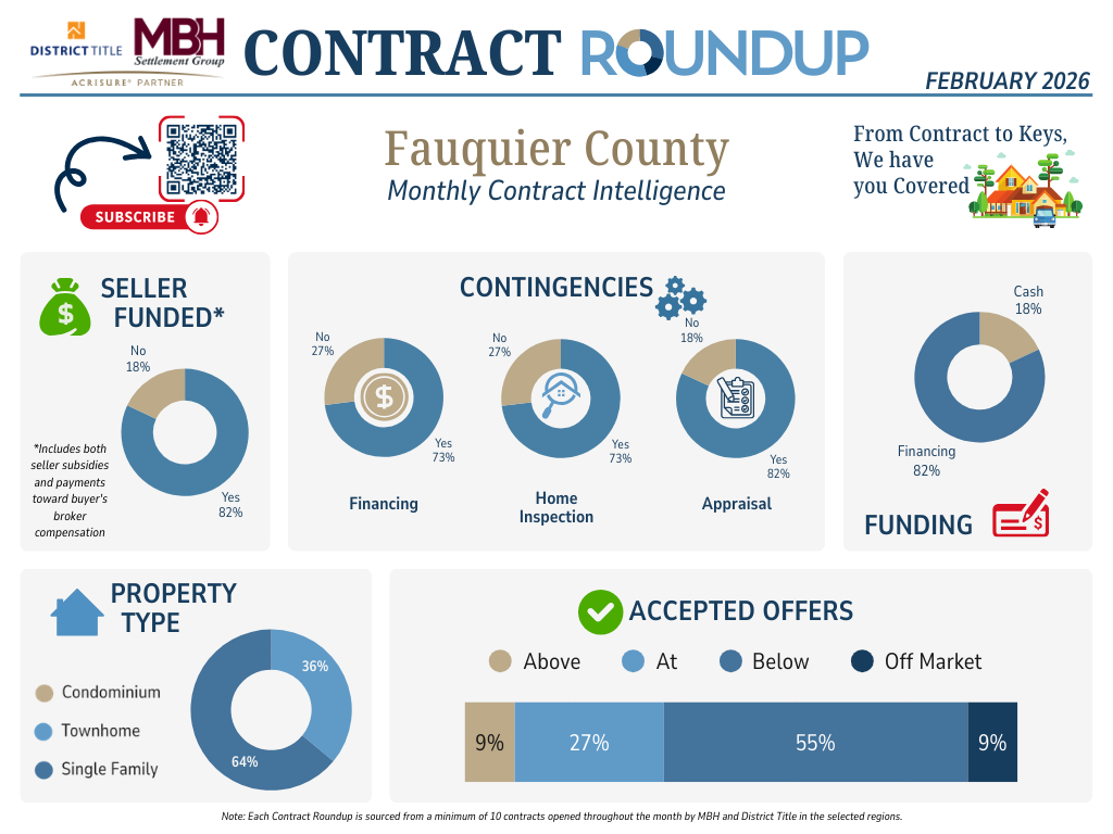 Fauquier County reflected a more buyer-favorable pricing environment, with the majority of accepted offers (55%) coming in below asking price. Financing remained the dominant payment method at 82%, and single-family homes accounted for the largest share of transactions. Seller funding appeared in 82% of contracts, maintaining strong seller involvement in deal economics.