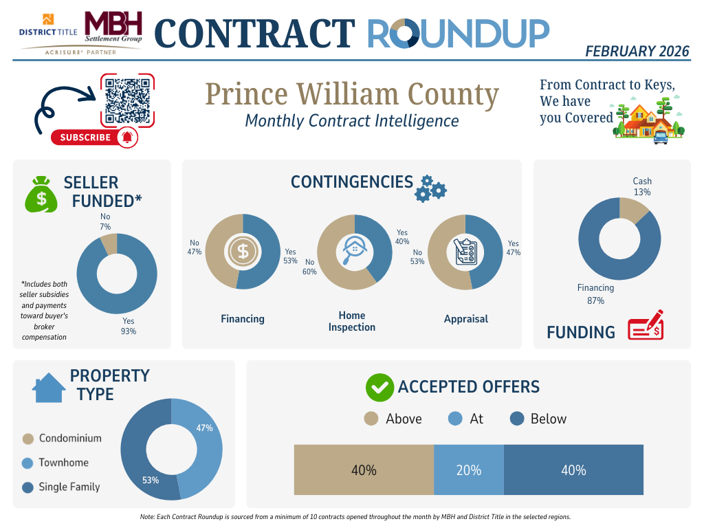 Prince William County showed a balanced negotiation environment, with accepted offers evenly split between above and below asking (40% each) and another 20% at list price. Financing remained strong at 87% of transactions, and the market leaned toward townhomes and single-family homes as the primary property types. Seller funding was present in 93% of deals, reinforcing continued seller support in closing costs and buyer-broker compensation.
